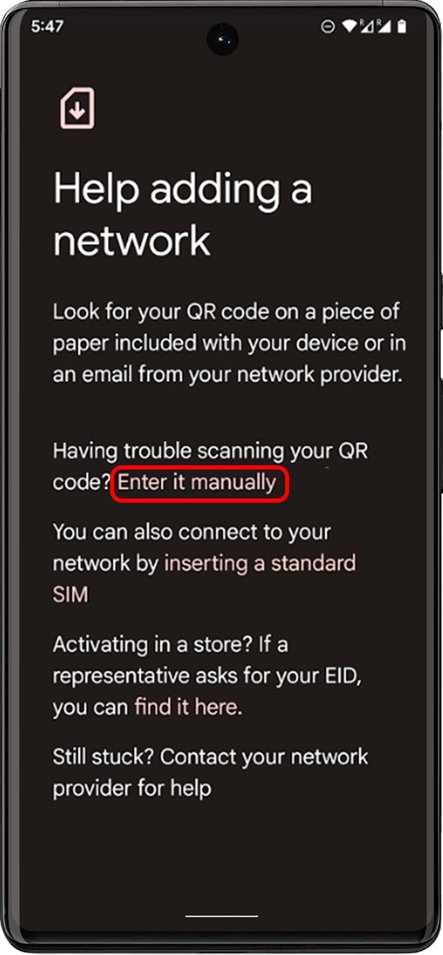 6. Click Enter Code Manually. Next, you need to enter the shared SM-DP+ address on the eSIM installation page