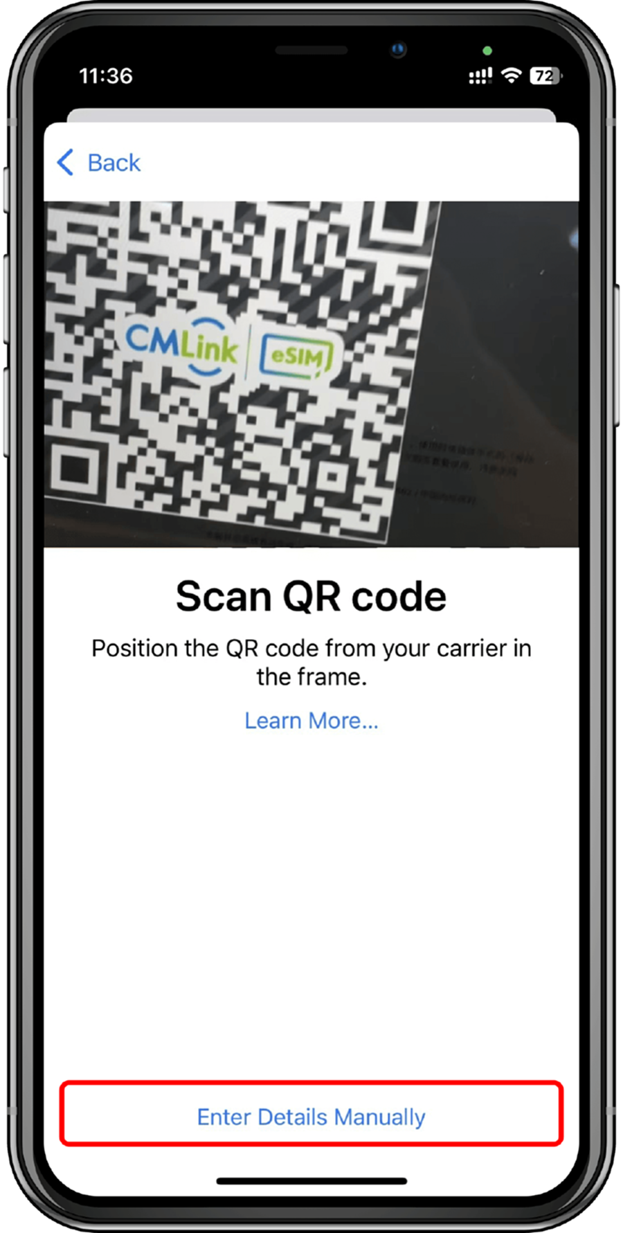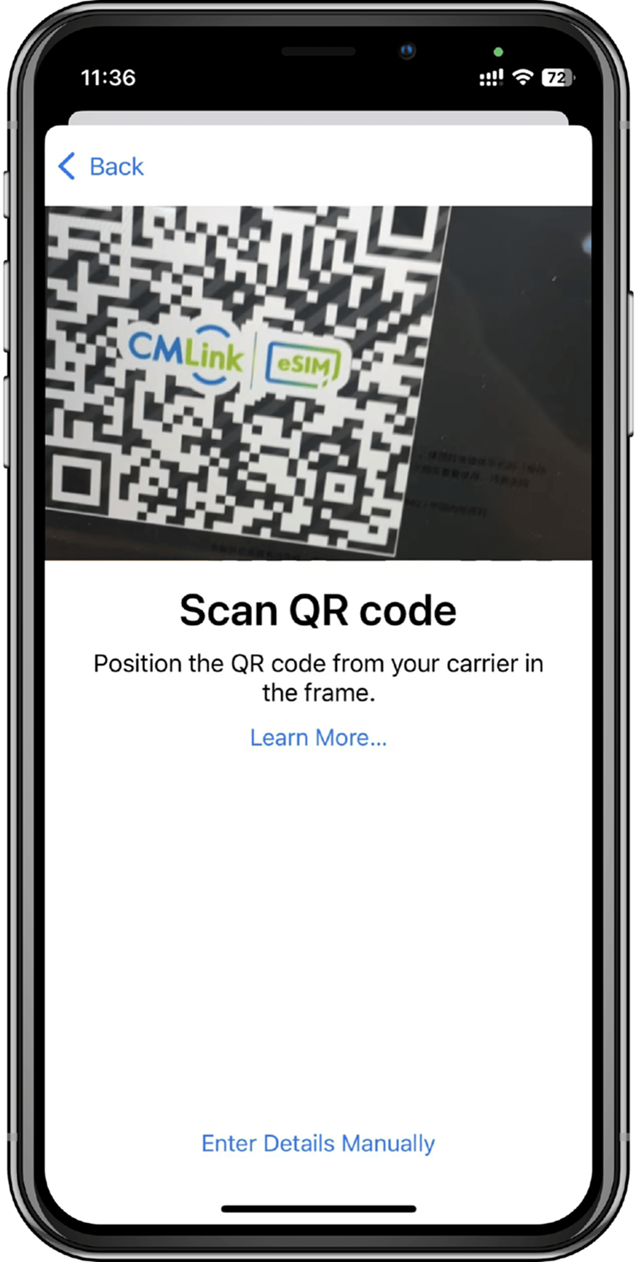 4. Scan the QR code provided on the CMLink eSIM App, tap 'Continue' twice and wait for a moment. Your eSIM will connect to the network, which may take a few minutes, and then tap 'Done'