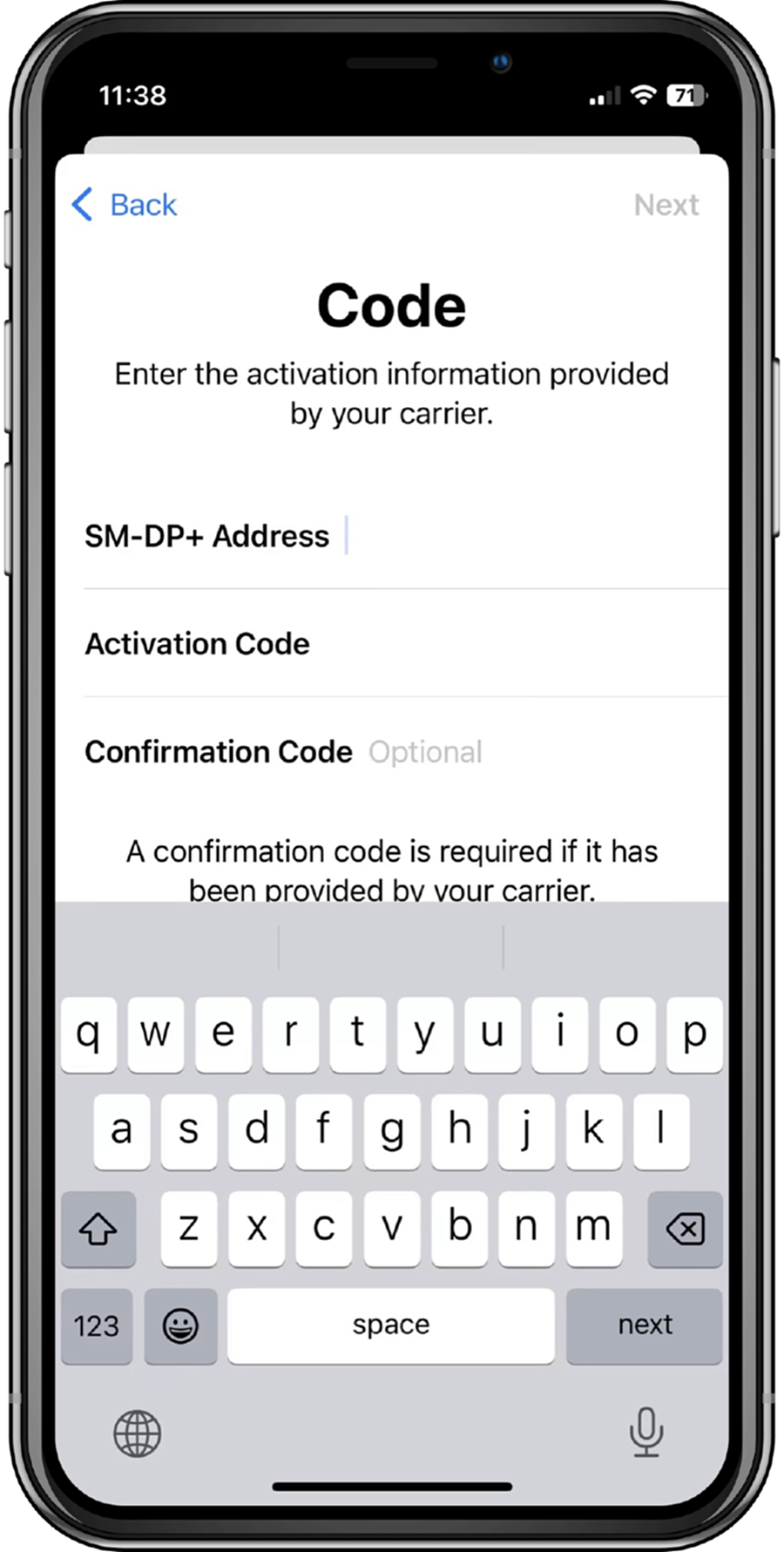 4. Enter the SM-DP+ address, activation code and confirmation code provided on the app by copying it, click 'Next' after enter, then tap 'Continue' twice and wait for a moment. Your eSIM will connect to the network, which may take a few minutes, and then tap 'Done'